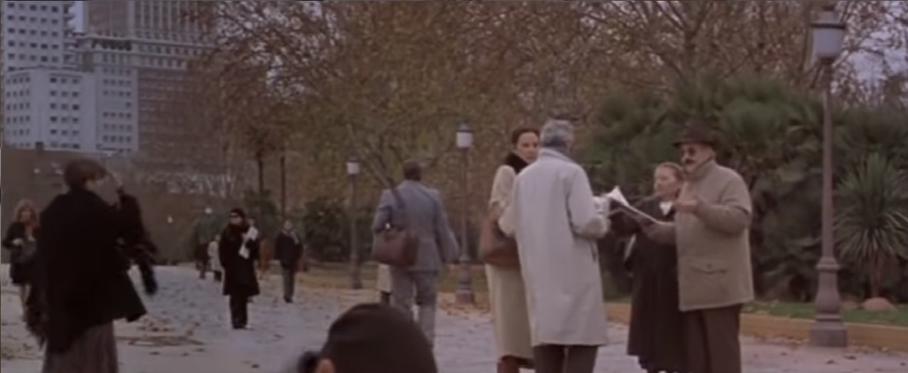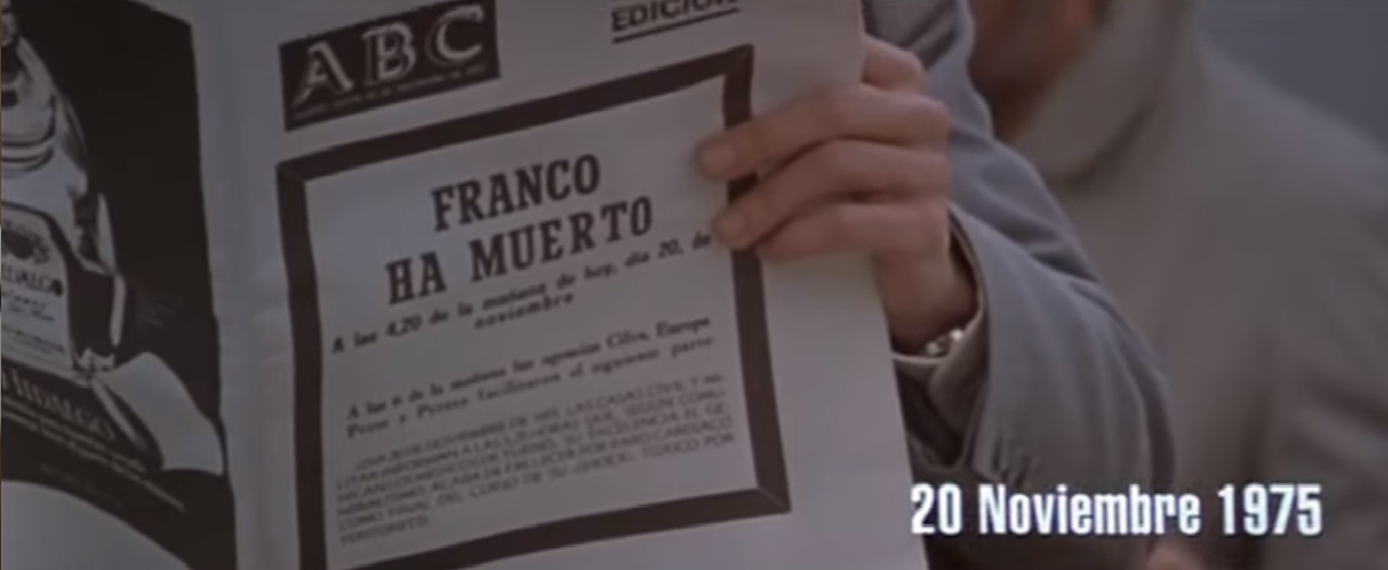 La película termina en la Plaza de España. De nuevo al lado de mi cole, del Fray Luis, que lo fue hasta que me cambié al Bernadette en Aravaca. Lo vemos, o lo intuimos, mezclado entre la gente, leyendo el ABC y en su portada vemos la noticia que dará paso a una nueva etapa en la Historia de España «Franco ha muerto».