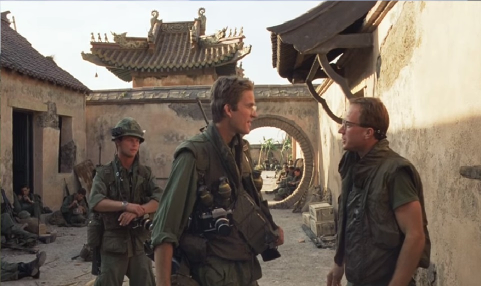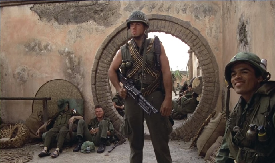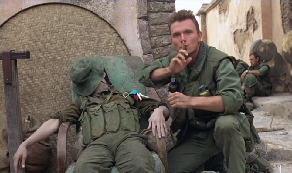 Escaramuzas, combates… sin sangre en las venas. Por eso decía antes que la peli va de más a menos. Empieza con una tensión brutal en el campamento. El sargento es una mala bestia que, en el fondo, interpreta su papel para formar y forjar a los muchachos. Pero mala bestia al fin y al cabo. La historia de patoso nos abofetea. Las reacciones de sus compañeros de armas también. El drama implícito de toda esa parte parece que nos hace sentir alivio cuando salen del campo de instrucción y aterrizamos en Vietnam. Qué tranquilidad…