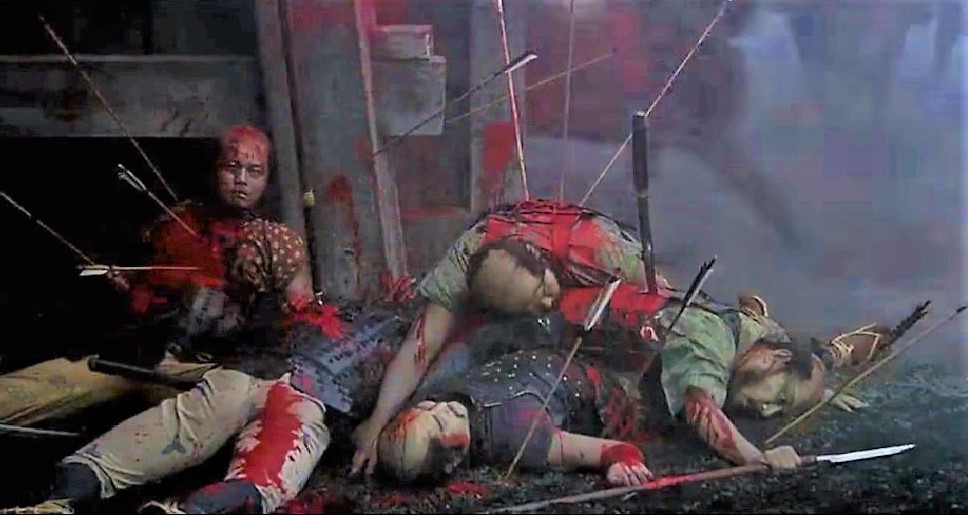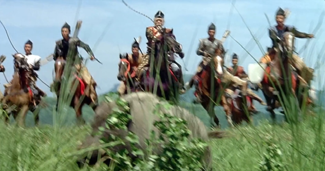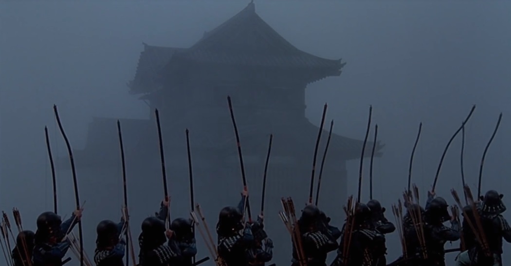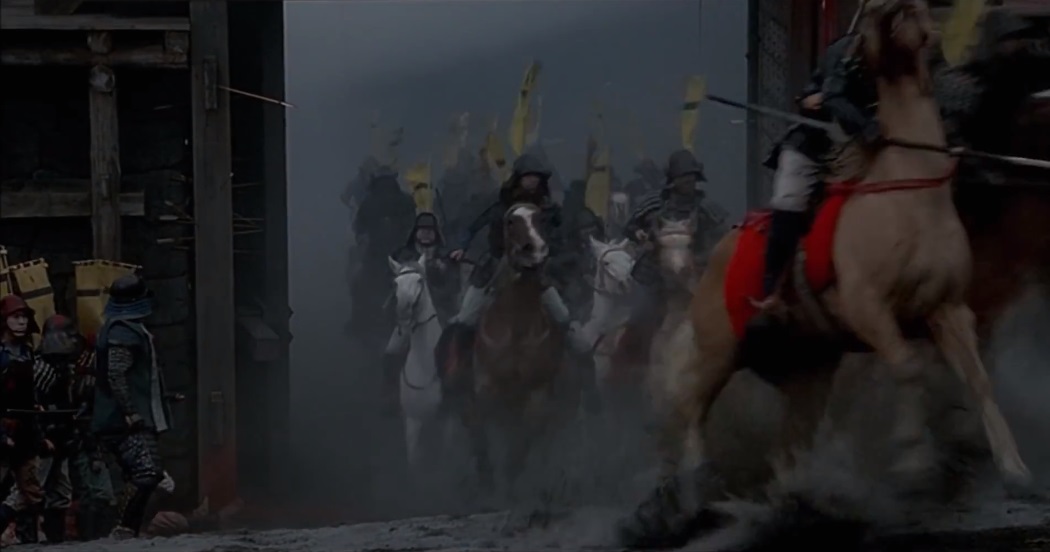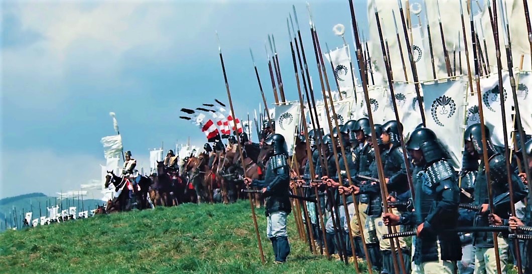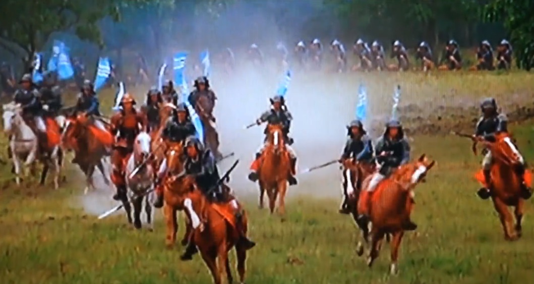 No debemos despistarnos: el arma más difundida entre los samuráis no fue la katana, que por supuesto era básica, junto con el wazikashi y el tanto (espada corta la primera y cuchillo largo el segundo). El arco era la esencia del samurái, como apunto en la primera frase del comentario de esta peli. Por eso la primerísima escena de la película nos muestra a Ichimonji Hidetora cazando jabalíes con arco. Nos posiciona en el pasado del samurái para luego ir dando paso al presente y por fin al futuro. Pero en cualquier caso, el arma de fuego se impuso, por práctico y hubo batallones enteros de arcabuceros que fueron desarrollando tácticas de disparo escalonado para acosar a la caballería rival con tandas sucesivas de descargas de plomo.