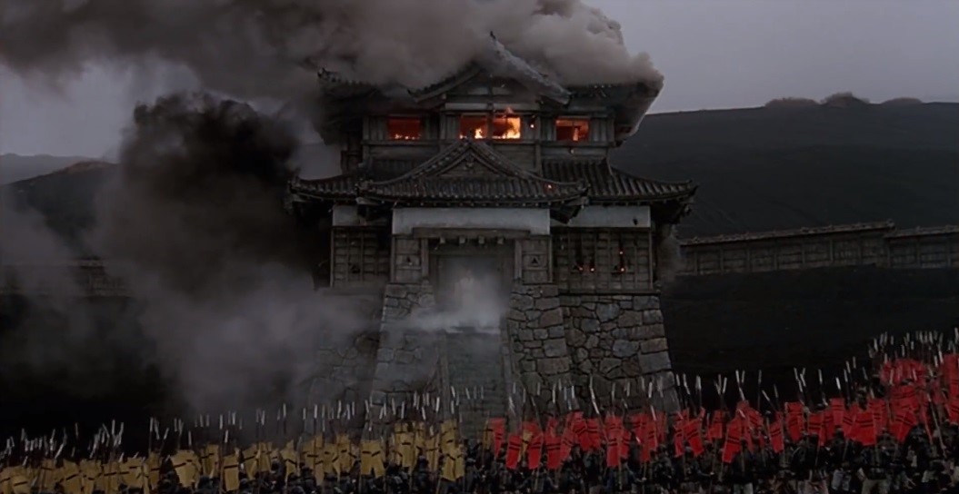 Las localizaciones no podrían haber sido más simbólicas y representativas del Japón: desde el mayor volcán en activo, Aso, a dos de los castillos más prototípicos de la época retratada la película: Kumamoto y Himeji. En la peli veremos arder un castillo de Hidemori: para grabarlo fue construido a escala real en la base del monte Fuji y quemado de verdad. El riesgo que esto entrañó, amén del físico con la cantidad de extras que pululaban por allí, fue la necesidad de grabar toda la escena en una toma única sin margen de fallo porque era inviable reconstruir el castillo en caso de que algo saliera mal. No deja de ser un detalle de lo meticuloso y extremadamente exigente que era Kurosawa. Algunos lo califican hasta de «enfermizo». Para haceros una idea podréis leer mi comentario de Los siete samuráis y su tratamiento del agua y la lluvia a lo largo de la película y, sobre todo, en la escena de la batalla contra los forajidos.